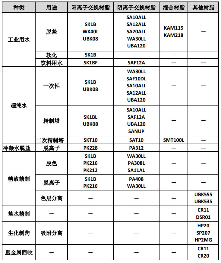 强酸阳树脂:SK1BL、WK60L、UBK08等