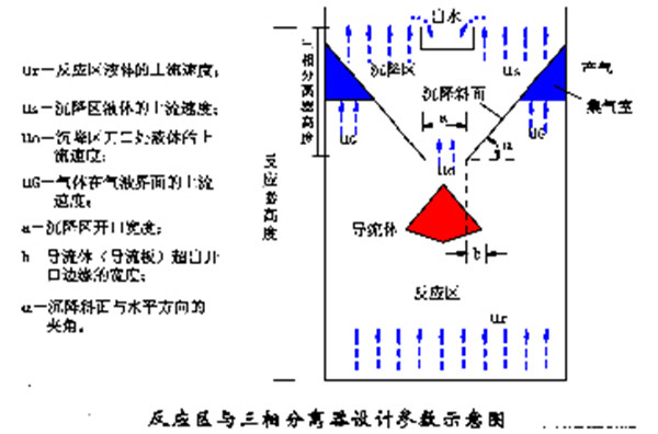 因水流和气泡的搅动,污泥床之上有一个污泥悬浮层。反应器上部有设有三相分离器,用以分离消化气、消化液和污泥颗粒。消化气自反应器顶部导出;污泥颗粒自动滑落沉降至反应器底部的污泥床;消化液从澄清区出水。UASB 负荷能力很大,适用于高浓度有机废水的处理。运行良好的UASB有很高的有机污染物去除率,不需要搅拌,能适应较大幅度的负荷冲击、温度和pH变化。