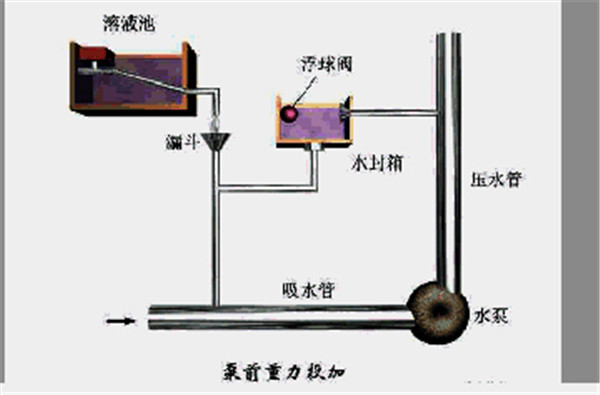 ►泵前重力投加是利用水泵叶轮的高速转动,使混凝剂迅速地分散到原水中。这种方法安全可靠,节省混凝剂,一般适用于取水泵距水厂较近者。