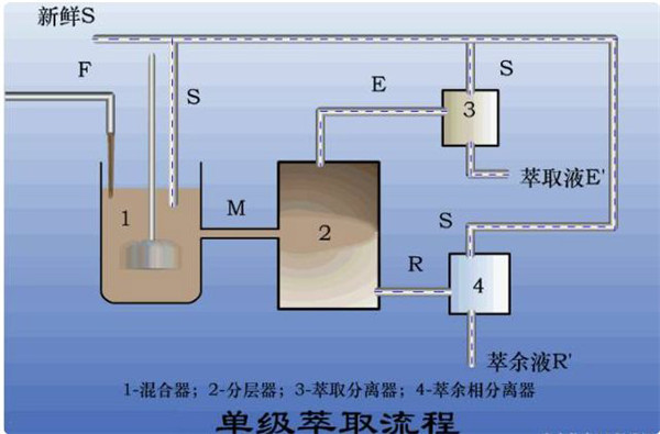 ►单级萃取又称一次接触萃取,利用萃取剂,通过萃取作用使废水得到净化是废水物理化学处理法之一。根据一种溶剂对不同物质具有不同溶解度这一性质,可将溶于废水中的某些污染物完全或部分分离出来。